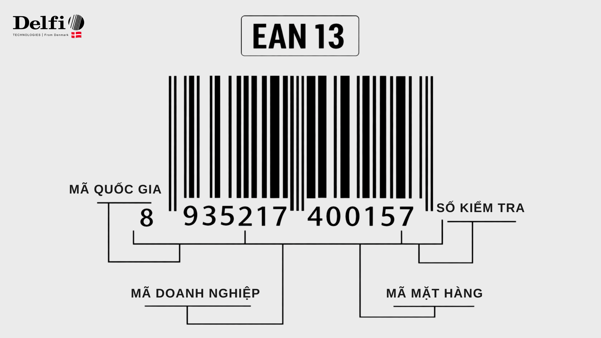 Một mã vạch EAN 13 luôn gồm 13 chữ số, trong đó 12 chữ số đầu tiên là dữ liệu chính và chữ số cuối cùng là số kiểm tra.