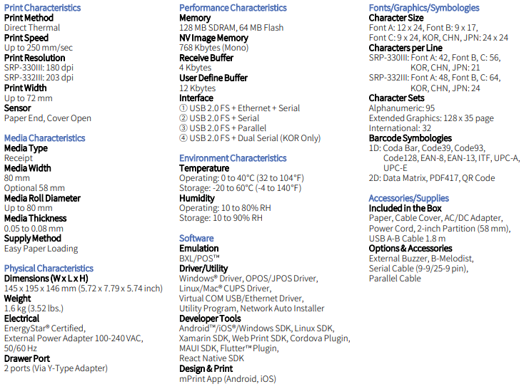 Thông số kỹ thuật máy in nhiệt Bixolon SRP-332III