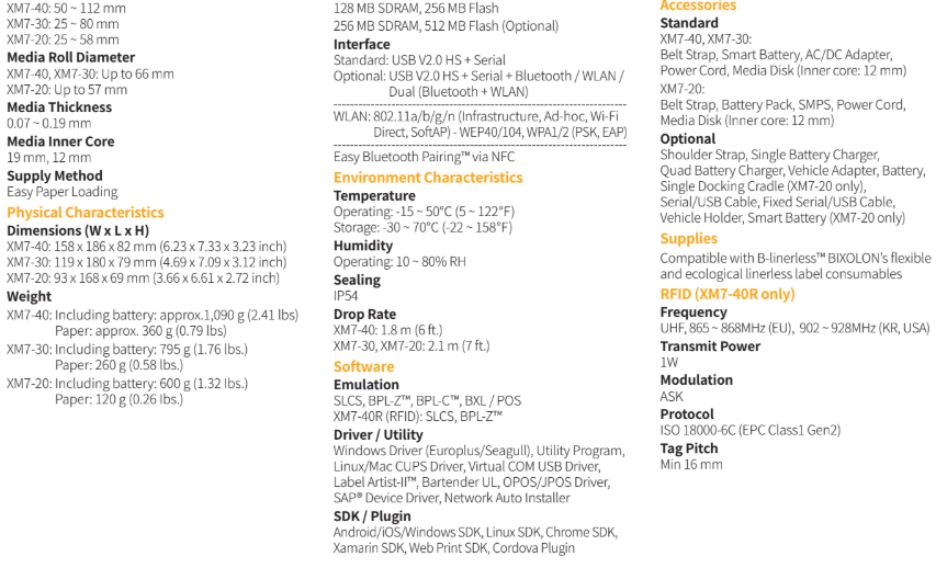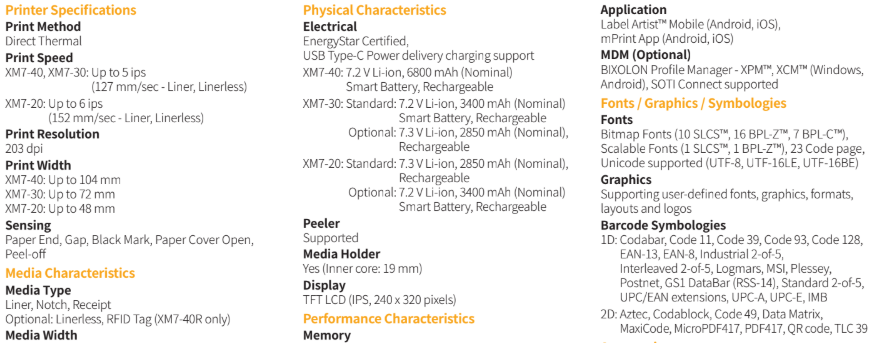 Thông số kỹ thuật máy in mã QR cầm tay Bixolon XM7