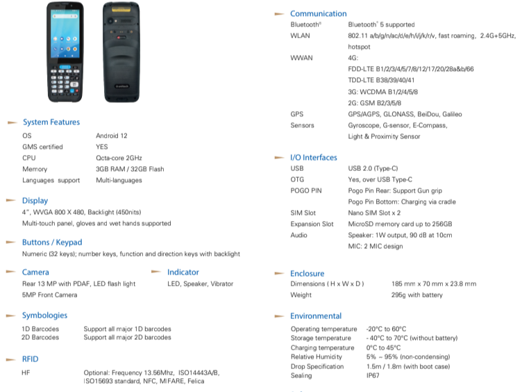 Thông số kỹ thuật của Máy kiểm kho Unitech HT330