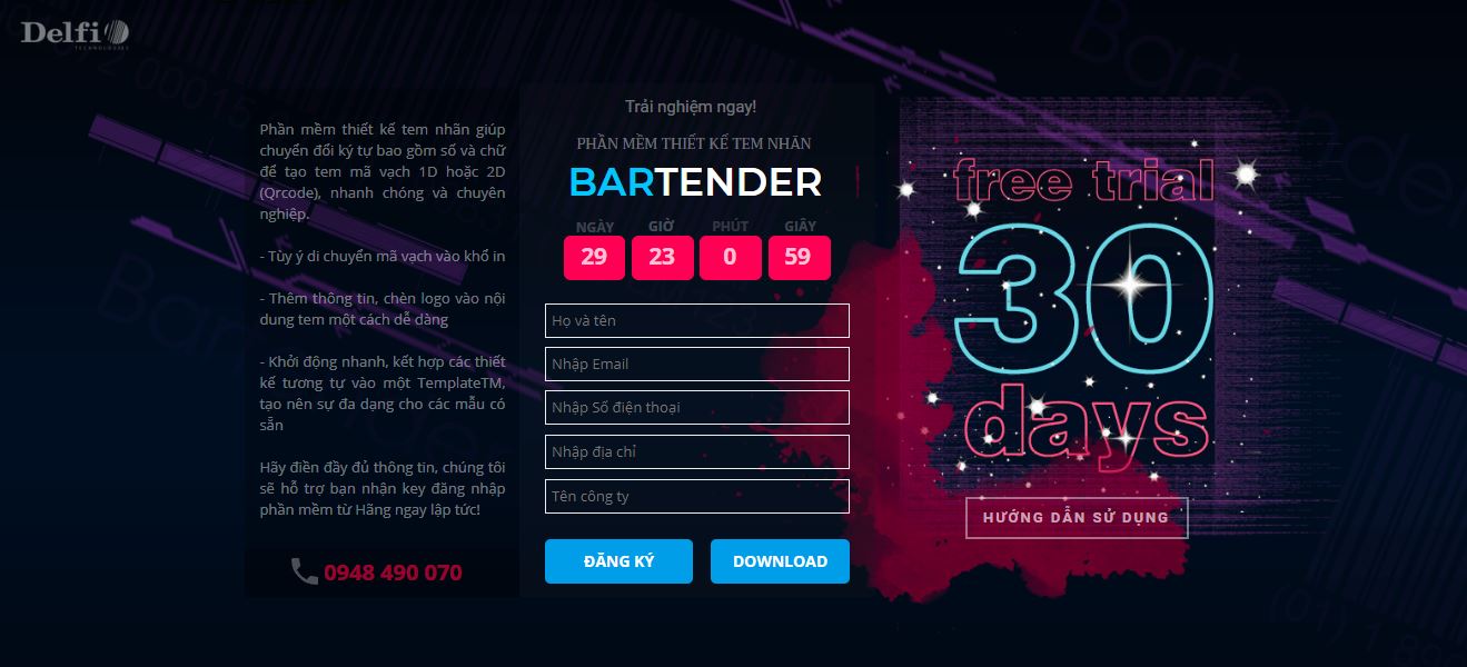 Ngoài link đăng ký vào hệ thống của Hãng, giờ đây Delfi còn hỗ trợ phiên bản dùng thử miễn phí 30 ngày, với cách thức đăng ký đơn giản và nhanh chóng hơn nhiều lần so với việc đăng ký trên hệ thống chính. Hy vọng sẽ mang đến cho bạn những trải nghiệm tốt nhất trên phần mềm thiết kế tem nhãn Bartender.